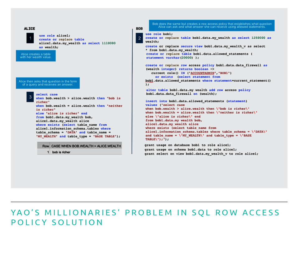 Next, Bob defines the exact statement or query he will allow, and inserts it into his “allowed statements” table. The statement includes the comparison of their wealth and the answers that will be returned in each case: “Bob is richer,” “Alice is richer,” or “Neither is richer.” Finally, he grants Alice permission to access and use his data for only this specific purpose. Alice then asks the question in the form of the specified query and receives the response: Bob is richer. Sorry, Alice.