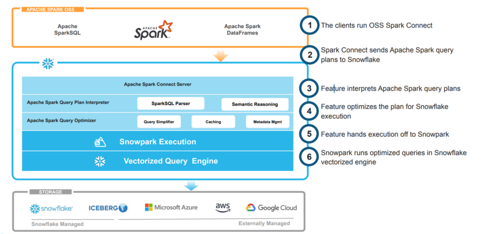 • Inside Snowflake, a Spark Connect server component parses, analyzes, and optimizes the plan (via Snowflake’s vectorized query engine) for execution—without moving data out.