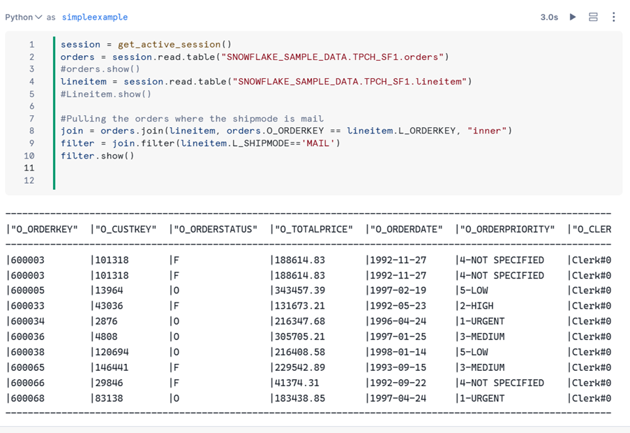 • SQL + DataFrame analytics: run joins, aggregations, and transformations via Spark syntax, executed by Snowflake.