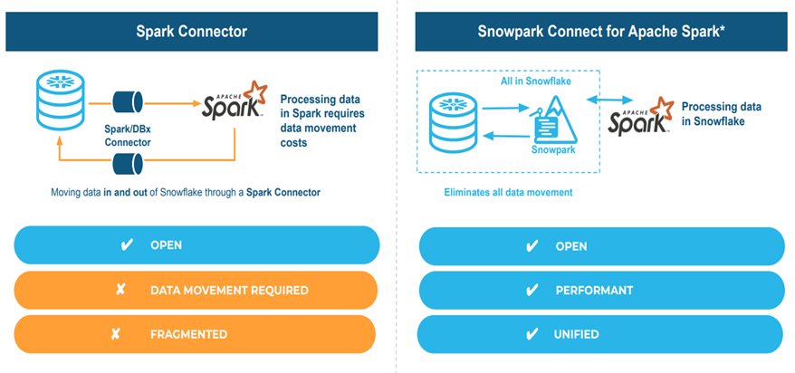 Data movementData is moved between Spark and Snowflake.Operations are directly executed in Snowflake to prevent data transfer.