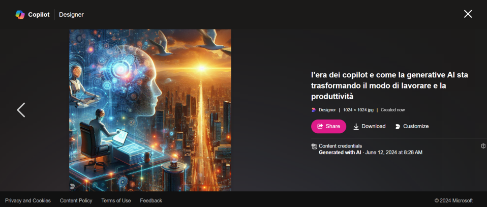 Di seguito un altro esempio concreto dell’utilizzo di Copilot Designer di Microsoft. Nello specifico qui la richiesta del prompt è: “l’era dei copilot e come la generative AI sta trasformando il modo di lavorare e la produttività”. Nell’immagine il visual realizzato dal copilot.