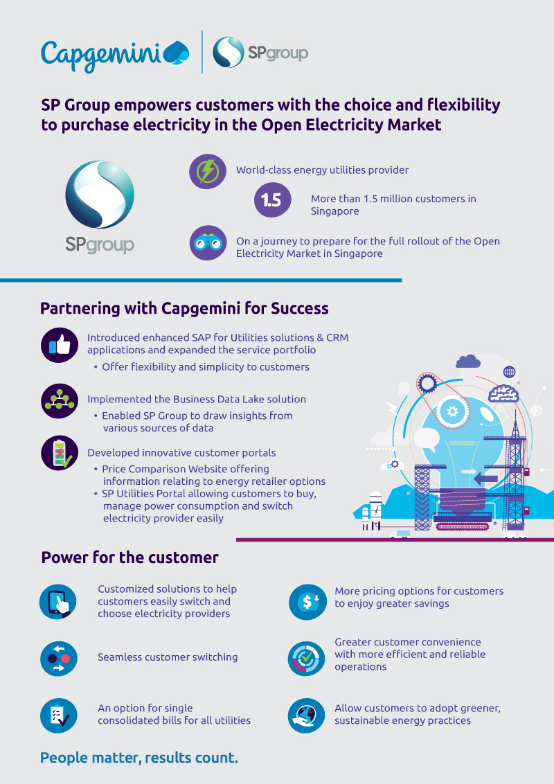 En alianza con Capgemini, SP Group lanzó un gran proyecto de transformación enfocado en habilitar el mercado abierto de electricidad y asegurar que los clientes se beneficien de sus compras de energía.  Capgemini fue elegido debido a su amplia experiencia y extenso conocimiento de la industria energética, así como su historial de implementaciones de soluciones de utilities y regulaciones complejas para clientes alrededor del mundo.