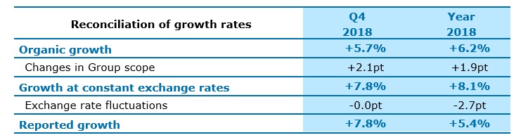 Para 2019, el Grupo espera un crecimiento de ingresos con un tipo de cambio constante de 5.5% a ​​8.0%, una mejor rentabilidad con un margen operativo del 12.3% al 12.6% y un flujo de efectivo libre orgánico más sólido, en una base comparable, de más de 1.1 miles de millones de euros.