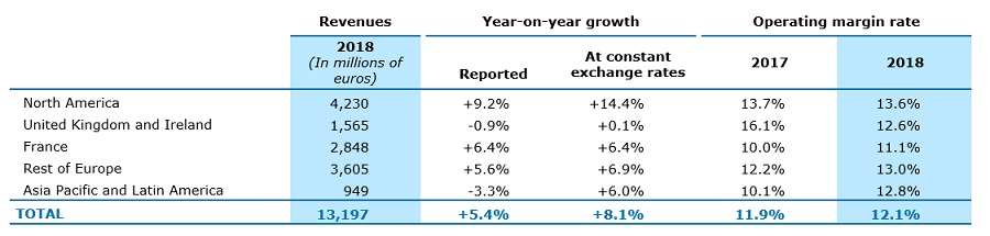 Para 2018, el margen de operación * fue de 1,597 millones de euros, o un aumento de 12.1% en los ingresos, un incremento del 7% o 20 puntos base interanual, en línea con los objetivos anuales. Esta mejora demuestra la capacidad del Grupo para conjugar inversiones tanto en talento como en su cartera de servicios por sector para obtener un crecimiento rentable. También refleja un margen bruto de utilidades más fuerte, particularmente en la segunda mitad del año. Geográficamente, las regiones que más contribuyen a este desempeño fueron Europa, Asia-Pacífico y América Latina.