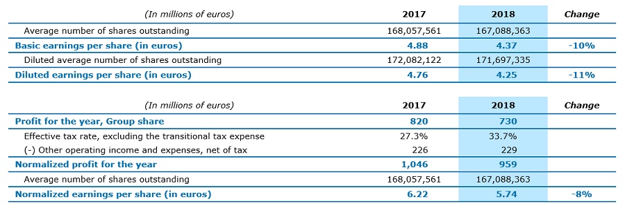 La ganancia neta (participación del Grupo) ascendió a 730 millones de euros en 2018, con una ligera baja en comparación con los 820 millones de euros registrados en 2017, debido a un gasto fiscal mayor. El BPA básico (ganancias por acción) es de 4.37 euros. El EPS normalizado * es de 5.74, o 6.06 ajustado por el gasto tributario de transición, lo cual representa un nivel cercano al reportado en 2017 (-3%).