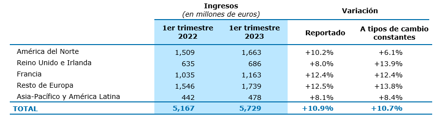 Los ingresos en la región Reino Unido e Irlanda (12% de los ingresos del Grupo en el primer trimestre de 2023) aumentaron un +13.9% a tipos de cambio constantes, impulsados por un fuerte crecimiento en los sectores de Manufactura y Bienes de Consumo, y el sólido desempeño de Servicios Financieros y Sector Público.