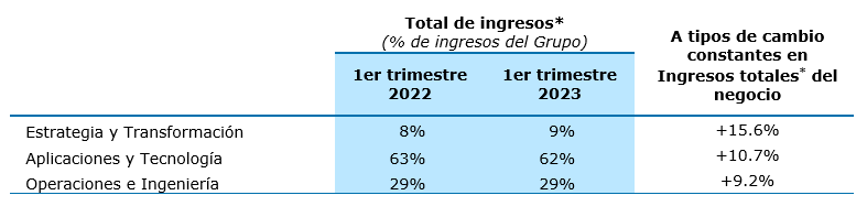 Los servicios de Estrategia y Transformación (9% de los ingresos del Grupo en el primer trimestre de 2023) y los servicios de Aplicaciones y Tecnología (62% de los ingresos del Grupo y el principal negocio de Capgemini) registraron un crecimiento en los ingresos totales* a tipos de cambio constantes de +15.6% y +10.7%, respectivamente. Este fuerte impulso, aunque está desacelerándose en comparación con 2022 como se esperaba, refleja la prioridad que los clientes del Grupo dan a sus proyectos estratégicos de transformación digital.
