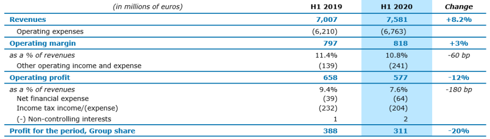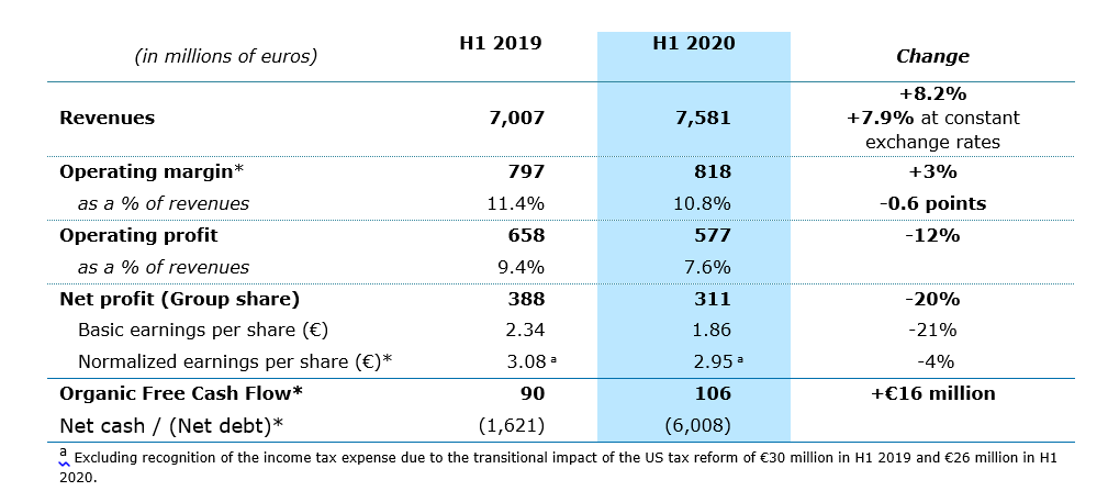 Durante el primer semestre de 2020, Capgemini completó exitosamente la oferta de compra amistosa de Altran Technologies (“Altran”), que está totalmente consolidada en las cuentas del Grupo a partir del 1 de abril de 2020. Esta importante transacción posiciona al Grupo como el socio de elección para la transformación digital de compañías industriales y tecnológicas. Durante el mismo período, el Grupo también se enfrentó al impacto de la crisis del Covid-19 en sus diversos mercados, garantizando al mismo tiempo la seguridad de sus empleados y la continuidad de los servicios a todos sus clientes.