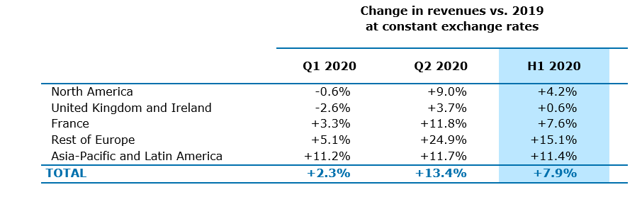 Geográficamente, el crecimiento orgánico se desaceleró significativamente en Francia durante el segundo trimestre en comparación con el primer trimestre. A pesar del fuerte impulso a principios de año, Francia registró el mayor descenso del crecimiento orgánico del Grupo en el segundo trimestre. Por el contrario, las regiones de América del Norte, Reino Unido e Irlanda, Asia-Pacífico y América Latina resistieron mucho mejor, con tasas de crecimiento orgánico del segundo trimestre comparativamente más cercanas a las registradas en el primer trimestre. Esta disparidad puede atribuirse a diferencias en la duración y severidad de las medidas de confinamiento y la combinación de sectores en diferentes países.