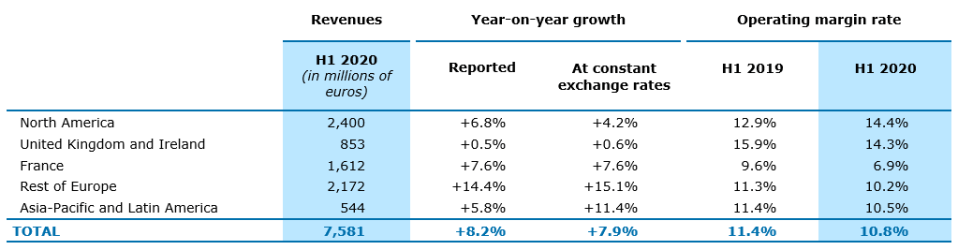 Por último, el impulso se mantuvo fuerte en la región de Asia-Pacífico y América Latina, con ingresos que aumentaron +11.4% a tipo de cambio constante. Este desempeño es particularmente notable ya que la adquisición de Altran tuvo un impacto más limitado en esta región. El crecimiento orgánico se mantuvo, impulsado especialmente por Servicios Financieros, así como por el sector de Servicios y, en menor medida, por Energía y Servicios Públicos. El margen operativo de la región registró una disminución limitada al 10.5%, del 11.4% en el primer semestre de 2019.