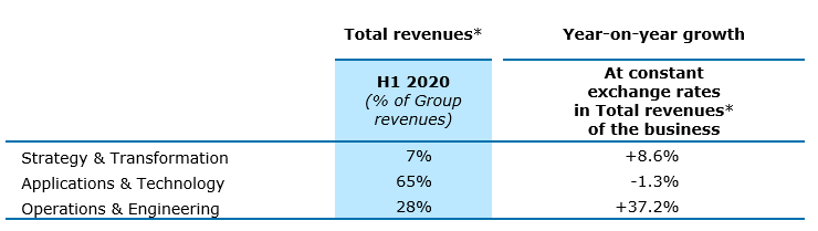 La combinación de negocios del Grupo cambió notablemente en el segundo trimestre de 2020 con la integración de Altran, que ofrece principalmente Servicios de Ingeniería. Si bien los servicios de consultoría de Estrategia y Transformación continuaron generando 7% de los ingresos totales del Grupo en el segundo trimestre, los servicios de Operaciones e Ingeniería ahora representan 33% del negocio del Grupo con la adición de las actividades de ingeniería de Altran. Los servicios de Aplicaciones y Tecnología siguen siendo el principal negocio del Grupo, pero ahora solo representan 60% del negocio total.