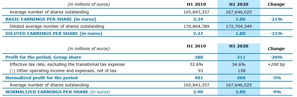 Las ganancias netas (participación del Grupo) descendieron -20% interanual a €311 millones durante los primeros seis meses del año. Las ganancias por acción básicas bajaron -21% interanual a €1.86, mientras que las ganancias normalizadas por acción* resistieron adecuadamente con un descenso moderado del -4% a €2.80. Las ganancias normalizadas por acción ajustadas por el gasto fiscal de transición también bajaron -4% a €2.95 euros.