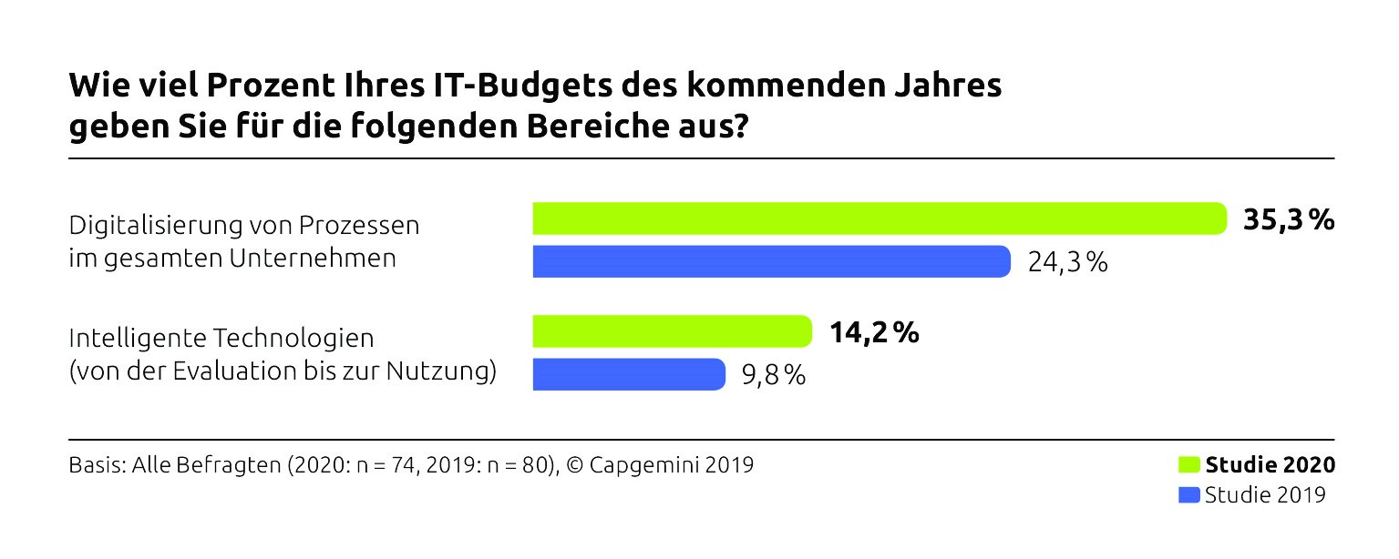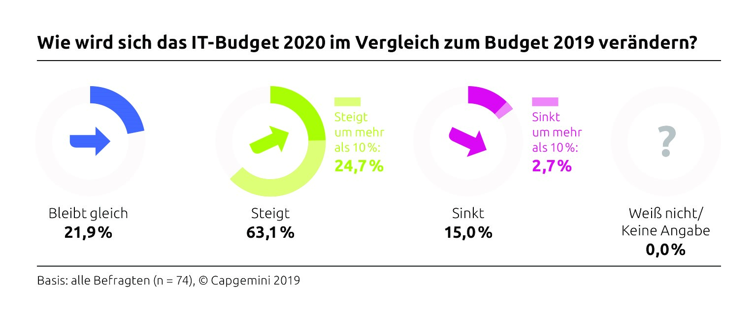 Trotz unsicherer Konjunkturaussichten steigen die IT-Budgets im kommenden Jahr weiter an. Nur wenige Unternehmen kürzen. Die Prognosen für 2021 sind ebenfalls positiv, das zeigen Vorab-Ergebnisse der IT-Trends-Studie von Capgemini. In diesem Jahr nahmen 120 IT- und Fachverantwortliche von Großunternehmen in Deutschland, Österreich und der Schweiz teil.