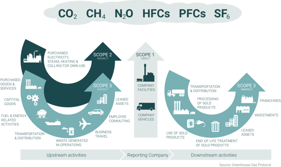 Een belangrijk onderdeel van de duurzaamheidsrapportage omvat de uitstoot van broeikasgassen door de organisatie en in de waardeketen. De grootste categorie broeikasgas is CO2. Dit komt voornamelijk in de atmosfeer terecht door verbranding van fossiele brandstoffen. CO2 uitstoot wordt onderverdeelt in drie categorieën zoals gedefinieerd door het greenhouse gas protocol[4]: