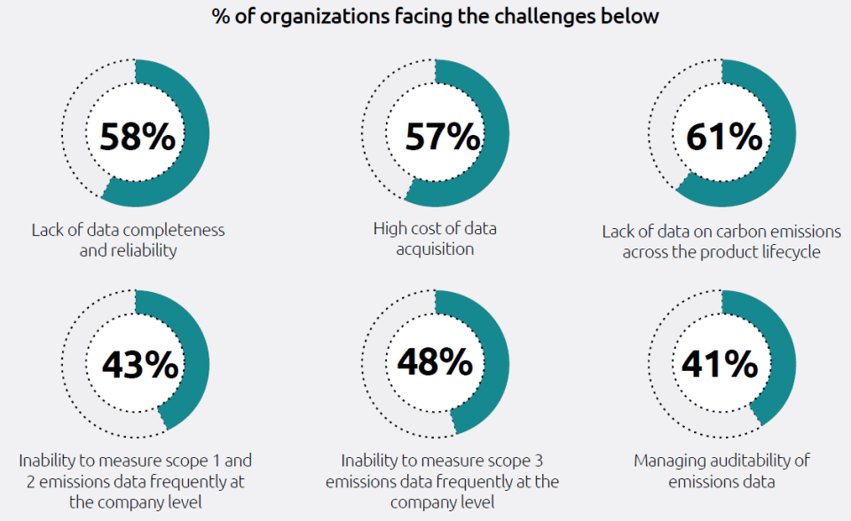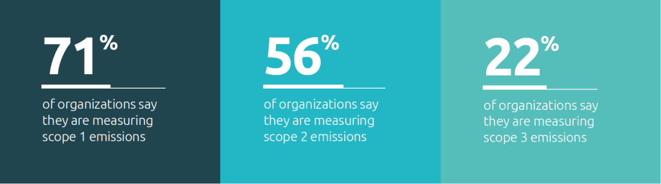 Uit het recente data for net zero rapport[5], waarvoor 900 CxOs ondervraagt zijn over hun net zero doelstellingen, blijkt dat de meeste ondernemingen nog niet goed zijn voorbereid om CO2-emissie data te verzamelen en hier inzichten uit te verkrijgen. Met name scope 3 emissie data is een uitdaging. Slechts 22% van de ondernemingen geeft aan dat ze momenteel scope 3 emissie data verzamelen.