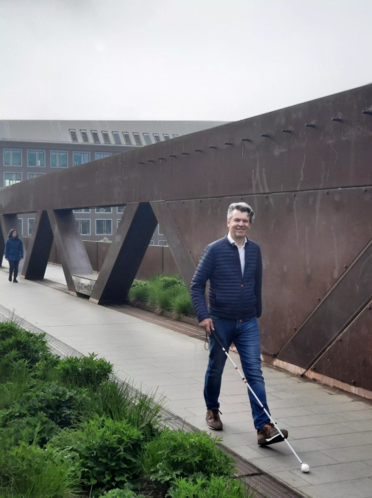 ‘Mijn beperking heeft een grote impact op mijn leven. Bijvoorbeeld op de plaats waar ik woon. Ik ben bewust vlak bij het station gaan wonen, zodat ik onafhankelijk kan blijven reizen. In mijn werk heb ik de switch van projectmanager naar coach gemaakt. Niet alleen omdat ik coachen een geweldig vak vind, maar ook omdat ik dit altijd kan blijven doen. Ook als ik blind ben. En mijn werkplek is zo ingericht dat licht en geluid voor mij optimaal zijn. De lampen die ik gebruik zijn op het plafond gericht, mijn luxaflex is mat en ik heb een conference call-toestel met topgeluid.’