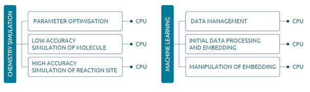 Figuur 1: Onderverdeling van een probleem op applicatie-niveau: links zien we een voorbeeld van een heterogene scheikundeworkflow, met gebruik van een CPU, een GPU en een QPU. Rechts zien we een voorbeeld voor een heterogene workflow voor machine learning.