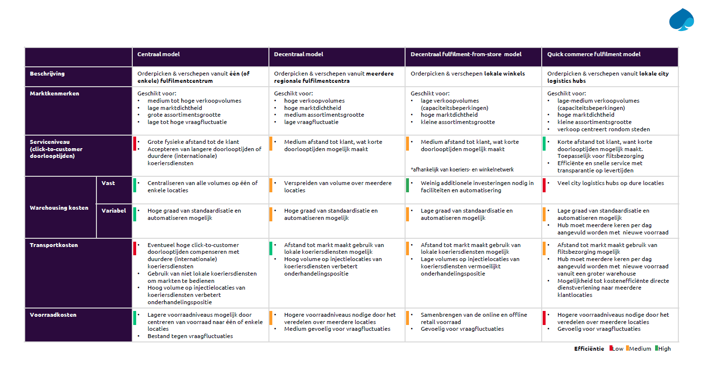 Het beschikken over het juiste supply chain netwerkmodel is een van de belangrijkste elementen in het realiseren van de beste service tegen de laagst mogelijke kosten. Het is goed om in het achterhoofd te houden dat er niet één best practice is, maar dat het gaat om het vinden van een passend model bij uw organisatie. De figuur hieronder toont vier mogelijke netwerkmodellen met hun respectievelijke specifieke eigenschappen, waarop een netwerkontwerp gebaseerd kan zijn.