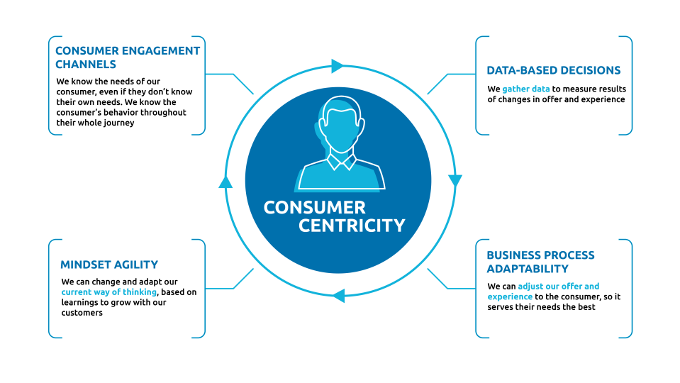 Nu is natuurlijk de vraag: hoe doe je dat? Wij onderscheiden vier gebieden die samen invloed hebben op het centraal stellen van de klant. Een goed begin is het definiëren van de klantenreis en daarmee de verschillende klant-kanalen op het goed moment en op de juiste manier in te zetten. Zo kun je op verschillende momenten observeren hoe de klant zich door de klantreis heen beweegt (door de zogenoemde “Consumer Engagement Channels”). Vervolgens is er relevante informatie over de consument nodig om te beoordelen hoe deze klant het huidige aanbod en de service ervaart. Op basis van deze informatie kan de service, ervaring of het aanbod richting de klant aangepast worden (“Data-based decisions”). Dit vergt weer aanpassingsvermogen van de retailer, zowel met betrekking tot de huidige manier van werken en besluitvorming, als de denkwijze van medewerkers (Business Process Adaptability). Wanneer retailers comfortabel worden met het maken van beslissingen gebaseerd op data, zal dit leiden tot een wendbare organisatie die snel kan inspelen op veranderende behoeften van de klant en een lerend vermogen opbouwt (Mindset agility). Deze stappen zullen er uiteindelijk voor zorgen dat je je klant beter kent en dus beter kunt bedienen. In de rest van dit artikel diepen we deze vier stappen verder uit.