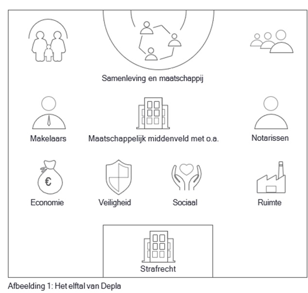Wanneer kunnen we nu stellen dat deze strijd de goede kant op gaat? Dat gaat in fases, aldus Depla. “De eerste fase was die van de georganiseerde criminaliteit versus de ongeorganiseerde overheid. Daarin begint nu verandering te komen. Men is beter in staat elkaar te vinden en de ook de meest voor de hand liggende partij naar voren te schuiven wanneer die aanpak het beste werkt. Het zijn niet altijd meer de politie en het OM. Soms heb je bijvoorbeeld meer aan de belastingdienst of een energieleverancier.” Op dit moment zit men dus in de tweede fase naar een georganiseerde overheid. Wat heeft Depla daarvoor nodig? “Een elftal” (zie afbeelding 1). Hij gebruikt deze metafoor van Hans Boutellier (bijzonder hoogleraar Polarisatie & Veerkracht op de Vrije Universiteit Amsterdam) vaker om zijn aanpak te beschrijven. Op doel het strafrecht, de keeper die moet vervolgen en straffen als dat nodig is. De verdediging bestaat uit de partners in het veiligheidsdomein, maar ook die uit het economische- ruimtelijke en sociale domein (denk aan politie, het Openbaar Ministerie, (jeugd) reclassering, UWV, woningbouwcorporaties, werkgeversorganisaties, bedrijven etc.). Veelal bestaande partners vanuit de overheid.