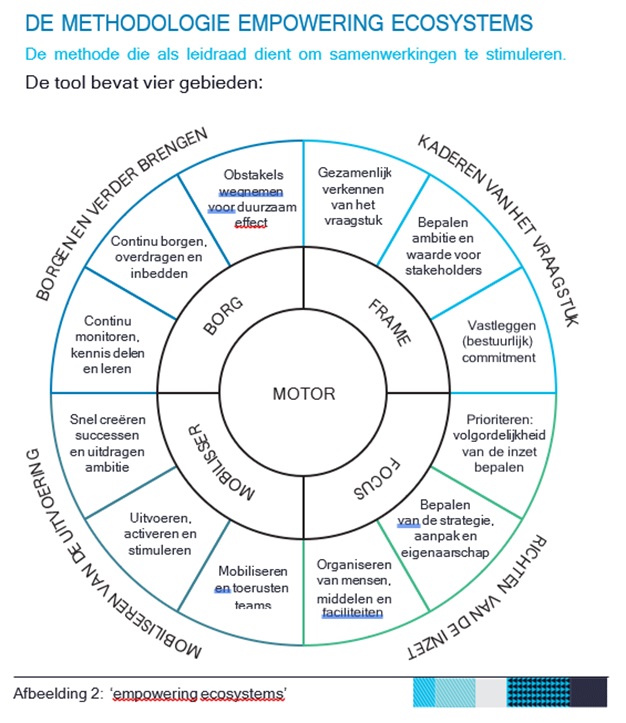Dit elftal is natuurlijk een metafoor voor een succesvolle netwerksamenwerking. Het ecosysteem waarbinnen deze partijen samenwerken vraagt om een motor die de boel draaiende houdt. Ook vanuit Capgemini is deze vorm van samenwerking al meerdere keren toegepast. Deze methodologie heet ‘Empowering Ecosystems’. Kort gezegd begint deze aanpak met het kaderen van de inzet (o.a. het bepalen van de definitie). In het voorbeeld van ondermijnende georganiseerde criminaliteit gaat het dus om de definitievorming. Wat willen we nu eigenlijk aanpakken? En waar ga je dat mee doen (je elftal)? Dat bestaat uit mensen en middelen in een duidelijk organisatie. We richten daarmee de inzet. Als derde stap moet je aan de slag en de uitvoering mobiliseren (successen boeken en uitvoeren). Juist in de aanpak van ondermijnende georganiseerde criminaliteit is het zo belangrijk om successen te boeken en ook te vieren. Daarmee laat je zien dat je succesvol kunt zijn. De laatste stap is het borgen en verder brengen (kennis delen, obstakels wegnemen en samen doorpakken en inbedden). Het is immers een aanpak van de lange adem. Het is kwetsbaar als dit op personen hangt en moet dus goed geborgd worden in de organisaties binnen het netwerk. In het verhaal van Depla klinkt deze aanpak overduidelijk door. Het elftal van Depla kadert, richt, voert uit en brengt verder. 3