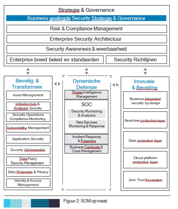 Als we deze groepen van security capabilities vanuit bedrijfsdoelstellingen, wet- en regelgeving en TOP 5 dreigingen samenvoegen en in een Security Operating Model plotten dan kan de SOM er as volgt zoals weergegeven is in Figuur 2.