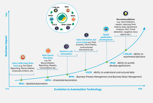 Maturity curve van hyperautomation met de onderliggende taken en dataprofielen van de processen die geautomatiseerd moeten worden, van stabiele, gestructureerde en voorspelbare data links tot aan ongestructureerde data rechts in de curve.