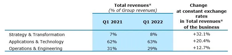 Strategy & Transformation (8% of Group revenues in Q1 2022) and Applications & Technology (63% of Group revenues and Capgemini’s core business) services continue to benefit from the broadbased demand for digital transformation, posting growth at constant exchange rates of +32.1% and +20.4%, respectively.