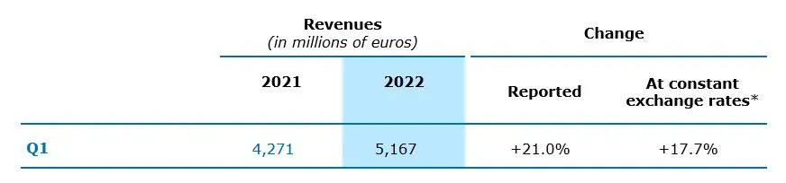 Paris, April 28, 2022 – The Capgemini Group reported Q1 2022 revenues of €5,167 million, up 21,0% year-on-year at current exchange rates and 17.7% at constant exchange rates*.