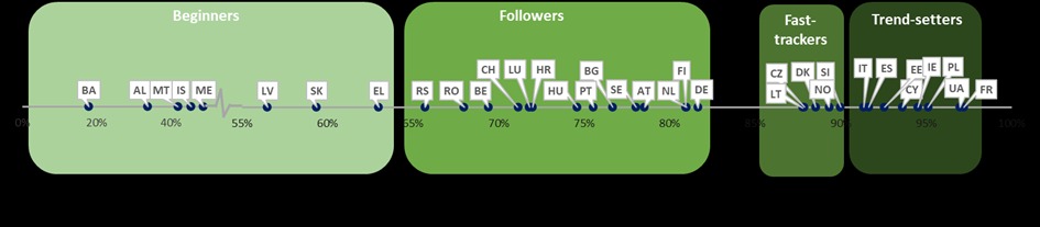 De volwassenheid van de landen die aan het verslag deelnemen, is geconcentreerd aan de bovenkant van het spectrum (meer dan 65%). Dit wordt benadrukt door de scores van de vijf landen in het “fast-tracker”-cluster, die vergelijkbare scores lieten zien, geconcentreerd in een range van 3% (88 tot 91 procentpunten).
