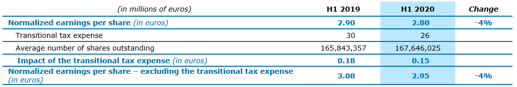 The Group recognized an income tax expense in respect of the transitional impact of the US tax reform of €30 million in H1 2019 and €26 million in H1 2020. This reduced basic and diluted earnings per share and normalized earnings per share by €0.15 in H1 2020.