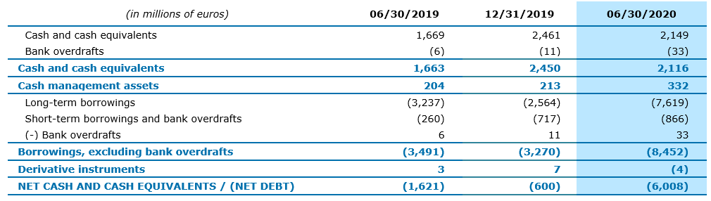 At June 30, 2020, the Group had cash and cash equivalents and cash management assets totaling €2.4 billion. After accounting for borrowings of €8.5 billion and derivative instruments, Group net debt* was €6.0 billion at June 30, 2020, compared with €1.6 billion at June 30, 2019 and €0.6 billion at December 31, 2019. This increase in net debt is mainly due to the acquisition of Altran.