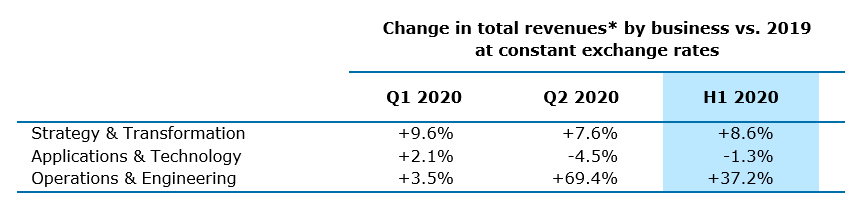 The Group’s business mix changed noticeably in Q2 2020 with the integration of Altran which primarily delivers Engineering services. While Strategy & Transformation consulting services continued to generate 7% of Group’s total revenues in Q2, Operations & Engineering services now account for 33% of Group business with the addition of Altran’s engineering activities. Applications & Technology services remain the Group’s core business, but now only represent 60% of total business.