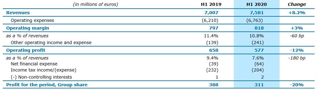 Other operating income and expenses represent a net expense of €241 million, up €102 million year-on‑year. This significant increase is mainly due to the Altran acquisition and integration costs, the inclusion of restructuring expenses specific to Altran and greater seasonality of restructuring costs in the first half of 2020.