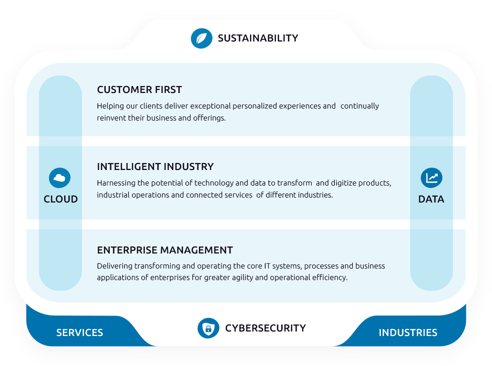 Onze focus ligt op het bevorderen van waarden binnen drie belangrijke gebieden: customer experience, intelligent industry en bedrijfsbeheer. Hiermee helpen we onze klanten belangrijke technologieën te omarmen, zoals cloud, data en AI. Ook werken we aan verbetering van hun cybersecurity en impact op het milieu.