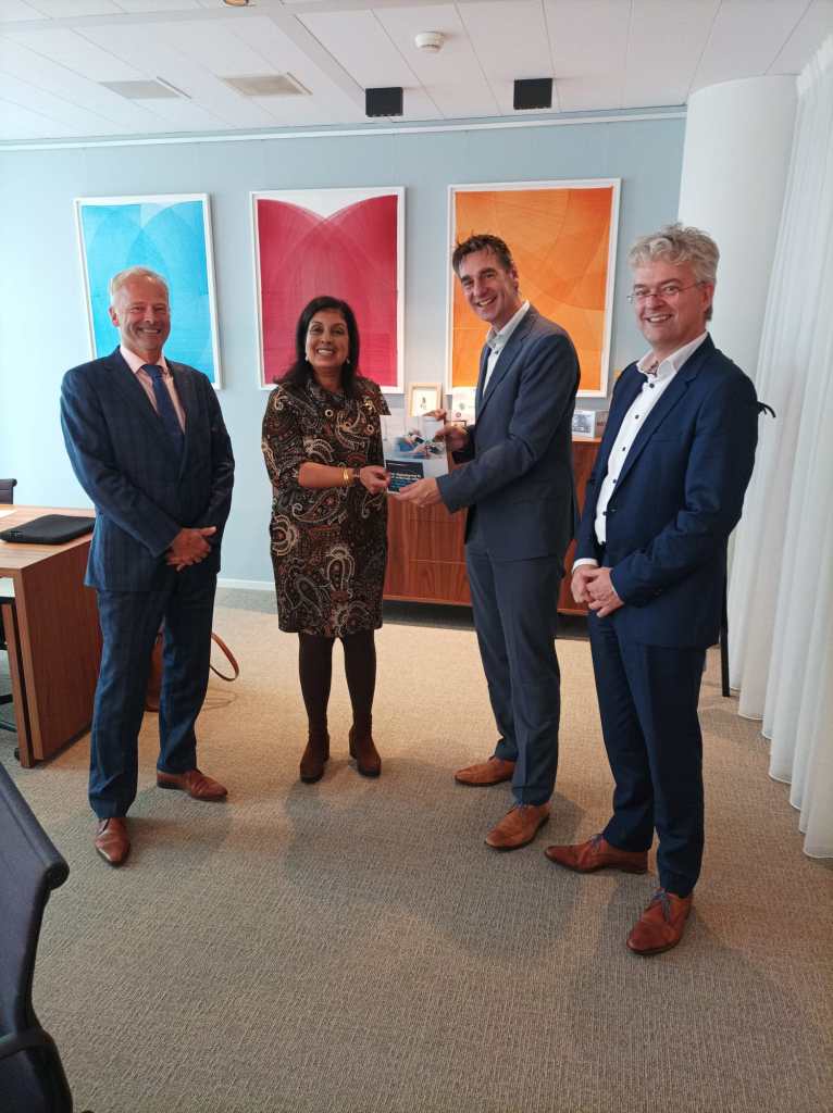 Het rapport werd op 31 oktober 2023 aangeboden aan Mariëlle Paul, Minister voor Primair en Voortgezet Onderwijs. Op de foto van links naar rechts: Zsolt Szabó (Vice President Business Innovaties Capgemini), Minister Paul, Pablo Derksen (Directeur Publieke Dienstverlening Capgemini) en Peter Nooteboom (Capgemini, Director Smart Society Capgemini en coördinator trendonderzoek).