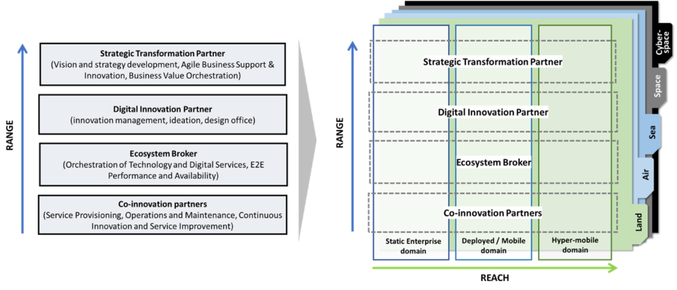Being successful in developing strategic digital partnerships starts with defining what type of partner is best for which part of the digital transformation scope and the desired outcomes. Additionally, the overall digital roadmap is to be defined: where and when you want to get results. Starting point is that in case of an external strategic partner the scope is not too broad to be digested by a single IT services & consultancy provider. It is therefore recommended to “slice” the digital transformation effort based on the “level of control” on the Y-axis. And select the best partner for each slice instead of selecting the best overall partner which might only be average in some areas of the transformation. In other words: select “best-of-breed” partnerships instead of a “best-of-suite” like partner. I refer to this as the “Reach & Range” partnership model which supports the vision that the future is defined by innovation through ecosystems. The slicing of the X-axis in the model can be done based on the organizational structure (E.g., groups of users, geographic locations, etcetera), the business model (E.g., Lines of Business) and/or the goals defined for the partnership. The following example shows a reach & range in which strategic, tactical, and operational level partnerships are mapped on the range axis, and military deployment type on the y axis. A further level of granularity is then added by including the operating domains: Land, Air, Sea, Space, and Cyberspace.