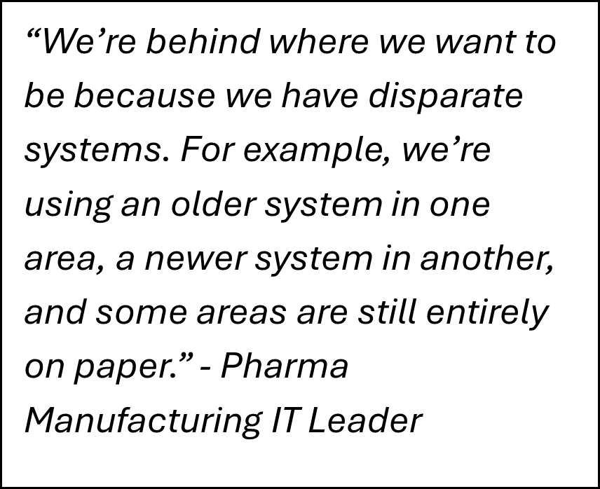 Today, MES deployments and daily operations in the pharmaceutical industry are often siloed. MES usually operates separately from other critical systems like Enterprise Resource Planning (ERP), Quality Management Systems (QMS), and Laboratory Information Management Systems (LIMS). This separation creates a fragmented landscape, often requiring custom-built interfaces, and leads to several challenges: