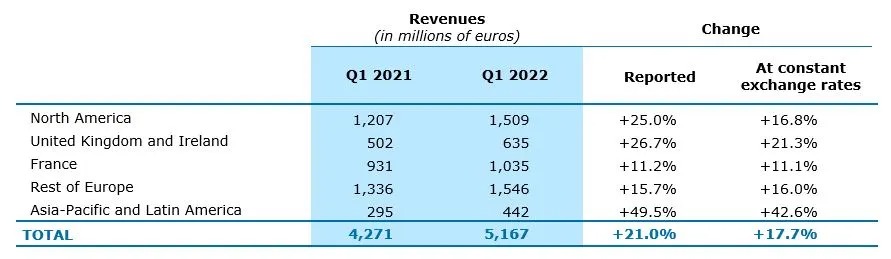 The United Kingdom and Ireland region (12% of the Group revenues in Q1 2022) again enjoyed a particularly robust quarter with revenue growth of +21.3% at constant exchange rates, driven primarily by the Public Sector and Consumer Goods.