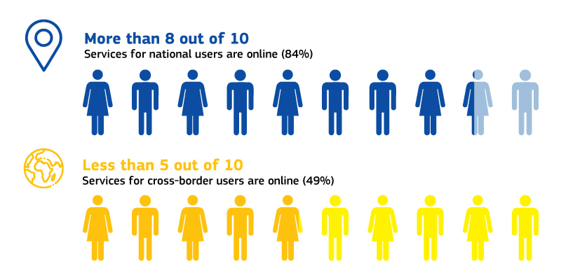 84% of services for national users and 49% of services for cross-border users are fully online. Moreover, services are often delivered in a more user-centric manner for national users. Cross-border users face many hindrances, such as language issues and being unable to authenticate with their own eID.