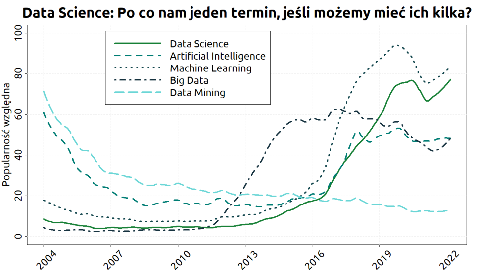 Thanks to Google Trends (see the graph above), one can easily check that “data mining” is a term which used to be popular but is not used anymore. “Artificial intelligence” used to be popular, then got abandoned in late 00 and recently became popular again. For a short moment, we got excited with “big data”, but then it became boring, so now we’re exploring “data science”.