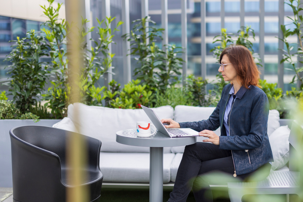 młoda kobieta uśmiechająca się na wprost kamery, siedzii na open space przy laptopie
