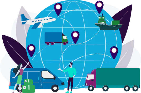 ikona z globusem i różnymi środkami transportu