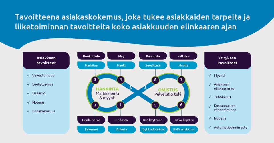 Asiakaspolun vaiheet eroavat keskenään riippuen tuotteesta tai palvelusta. Viitekehyksiä asiakaspolun mallintamiseen löytyy useita, mutta perusperiaate on sama: kata saumattomasti asiakaspolku alusta loppuun eli kiinnostuksen heräämisestä kohti uusintaostoa.