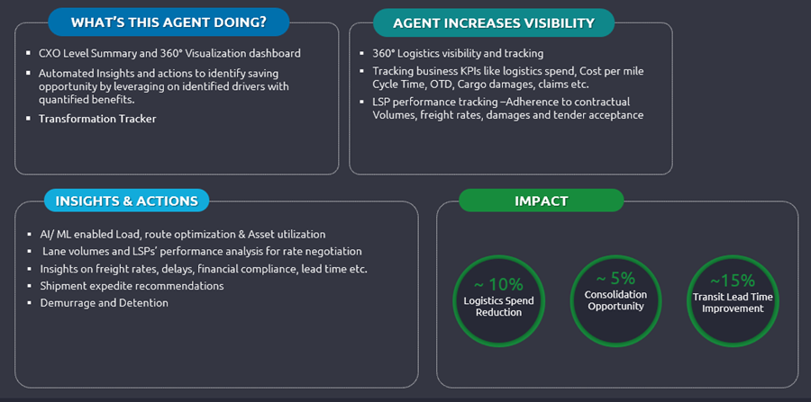 An analytics solution powered by agentic AI can incorporate multiple KPIs into its analysis – including logistics spend, cost per mile, cycle time, on-time delivery rates, cargo damage, and claims. It can also track performance of third-party logistics service providers – including on-time performance, adherence to contractual volumes, freight rates, damages, and tender acceptance.