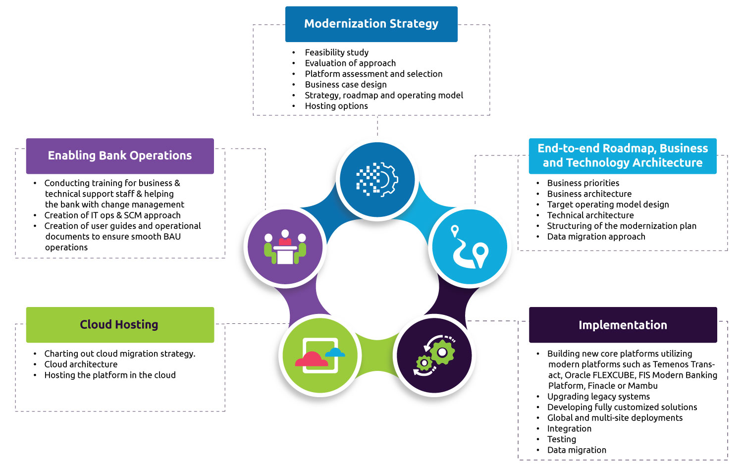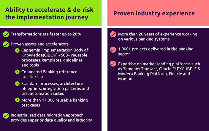 Capgemini’s business-led, technology-supported approach draws on deep global banking experience and ensures that the core banking solution is effective, efficient, and well-adopted by your business. Our capabilities include: