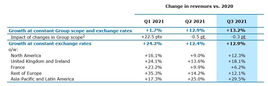All Group regions reported double digit organic growth (i.e. at constant scope and exchange rates) in Q3 2021. At constant exchange rates, the strong momentum in France was partially offset by the impact of the Odigo divestiture2. Since the comparison basis is significantly more demanding in Q3 compared to Q2, the underlying growth momentum actually strengthened this quarter.