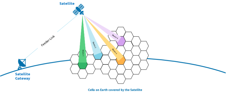 How do you get maximum coverage from each satellite? First, satellites today deploy multiple beams – you can picture a honeycomb pattern on the ground, with each cell corresponding to one beam. But modern 5G satellites take this one step further. In order to optimize satellite payload weight and limit the amount of energy consumption, the number of beams deployed on a satellite are typically much smaller than number of cells covered by it, meaning that one beam is responsible for multiple cells.