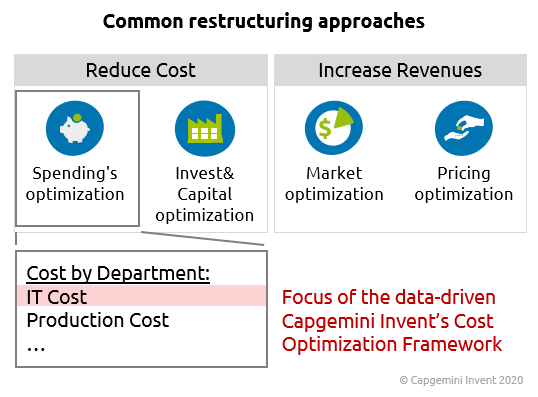 Restructuring demand is often driven by external factors, such as shrinking margins due to general economic conditions or greater competition. Restructuring programs are usually conducted with two major purposes: Reduce cost and/or increase revenues.