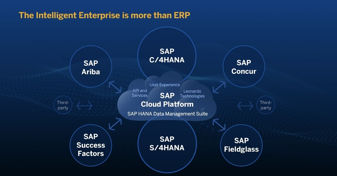 For SAP, Intelligent Enterprise is the integration of all their capabilities and components revolving around the SAP Cloud Platform. Intelligent enterprises effectively use their data assets to achieve their desired outcomes faster – and with less risk (per SAP).